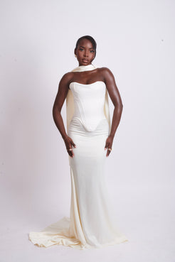 The Arusi Corset merges timeless romance with modern elegance. Crafted from luminous white satin that looks beautiful against the skin, this piece is designed to make every occasion feel like a dream. Its flattering lace-up back allows for a sculpted, adjustable fit that sinches the waist up to 2 inches, while the convenient side zip ensures effortless wear. Removable straps offer endless styling possibilities, from graceful sophistication to sultry minimalism. Complete the look with the matching satin maxi skirt, cut in a mermaid shape with a dramatic train that floats with every step. Wear it once, and you’ll find reasons to wear it forever.